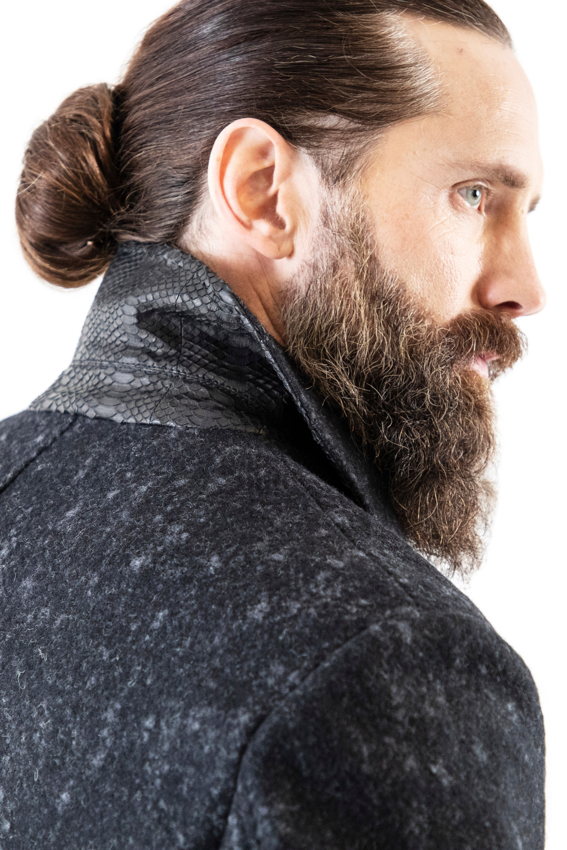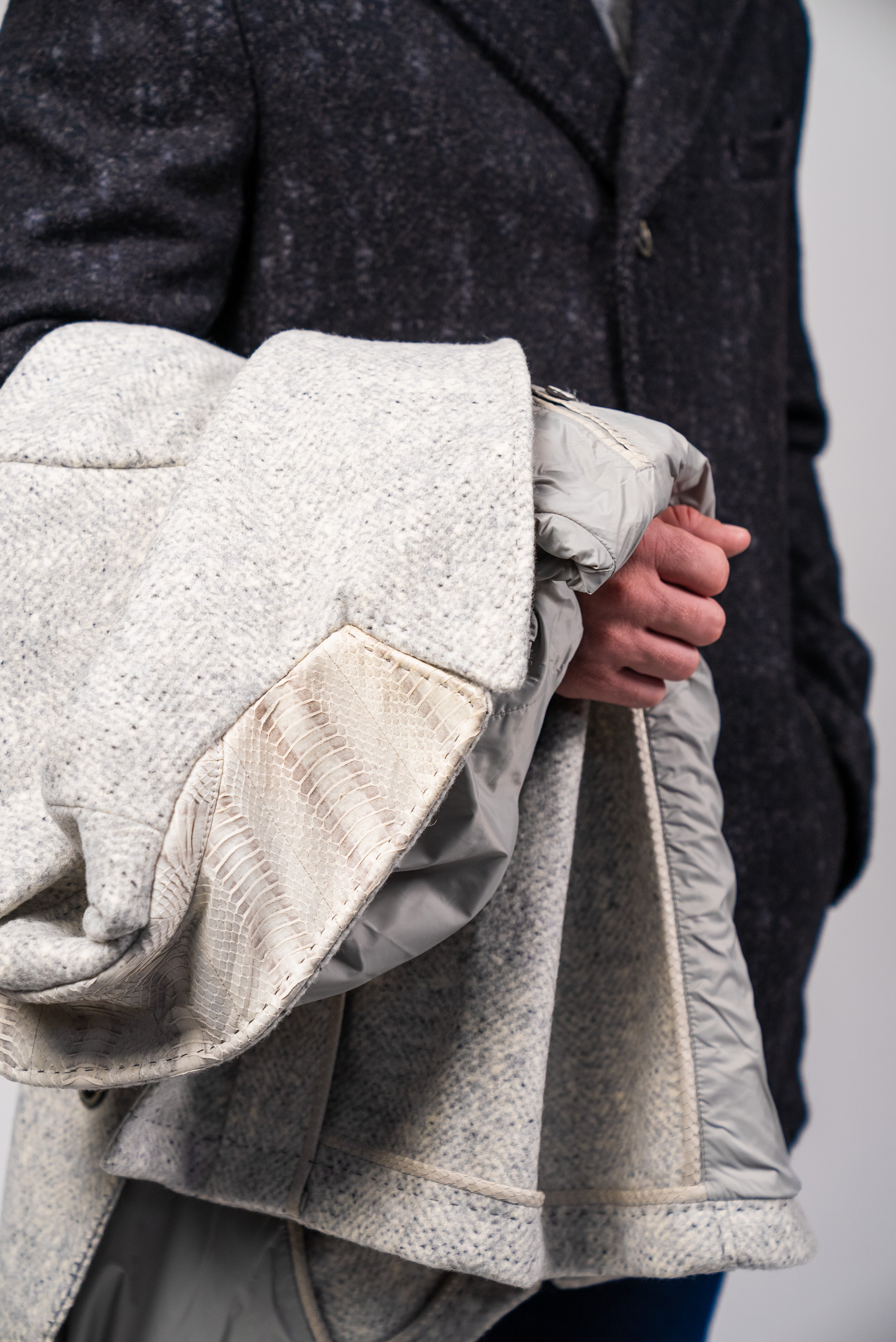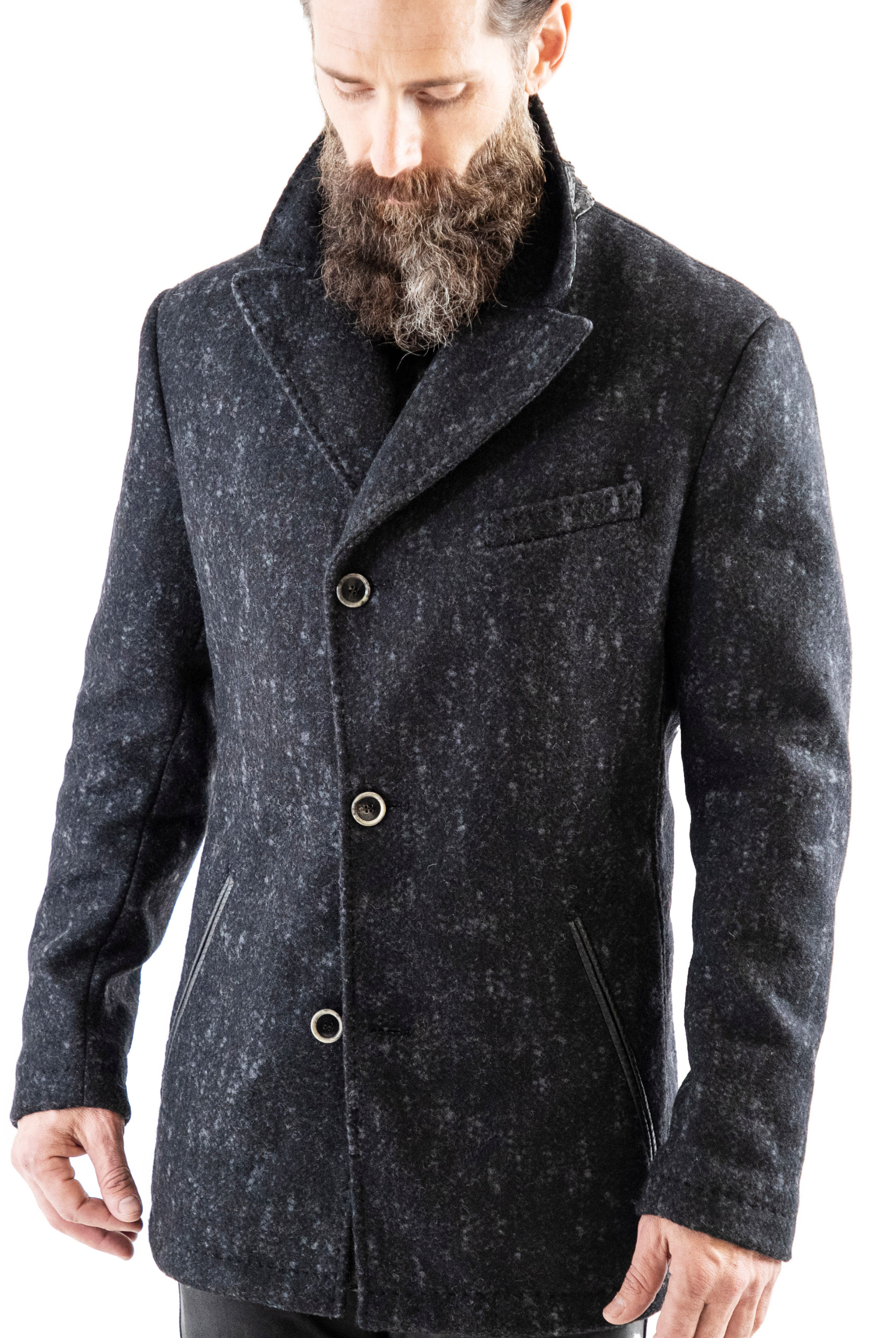 This partly snakeskin leather jacket was designed for Berlin fashion, crafted into a warm and comfortable alpaca men's coat with unique horn buttons.