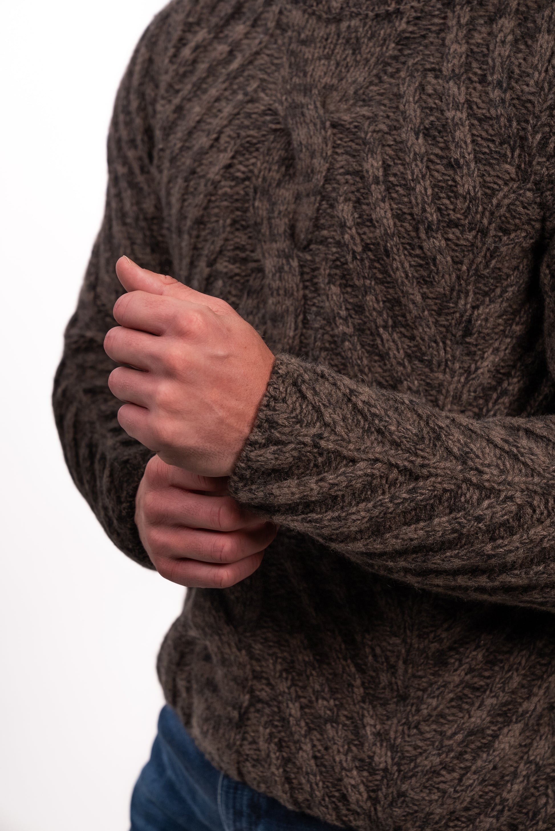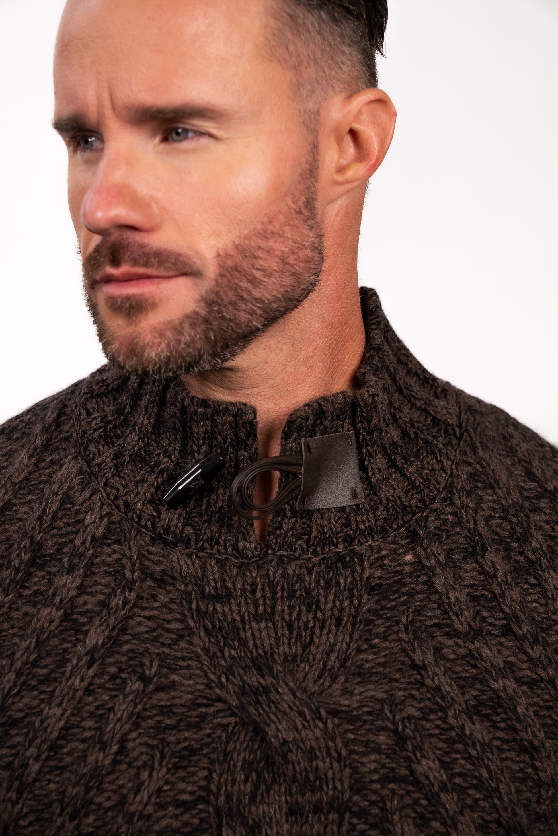 Three-gauge micromouliné cashmere with vegetable tanned leather latch and horn toggle