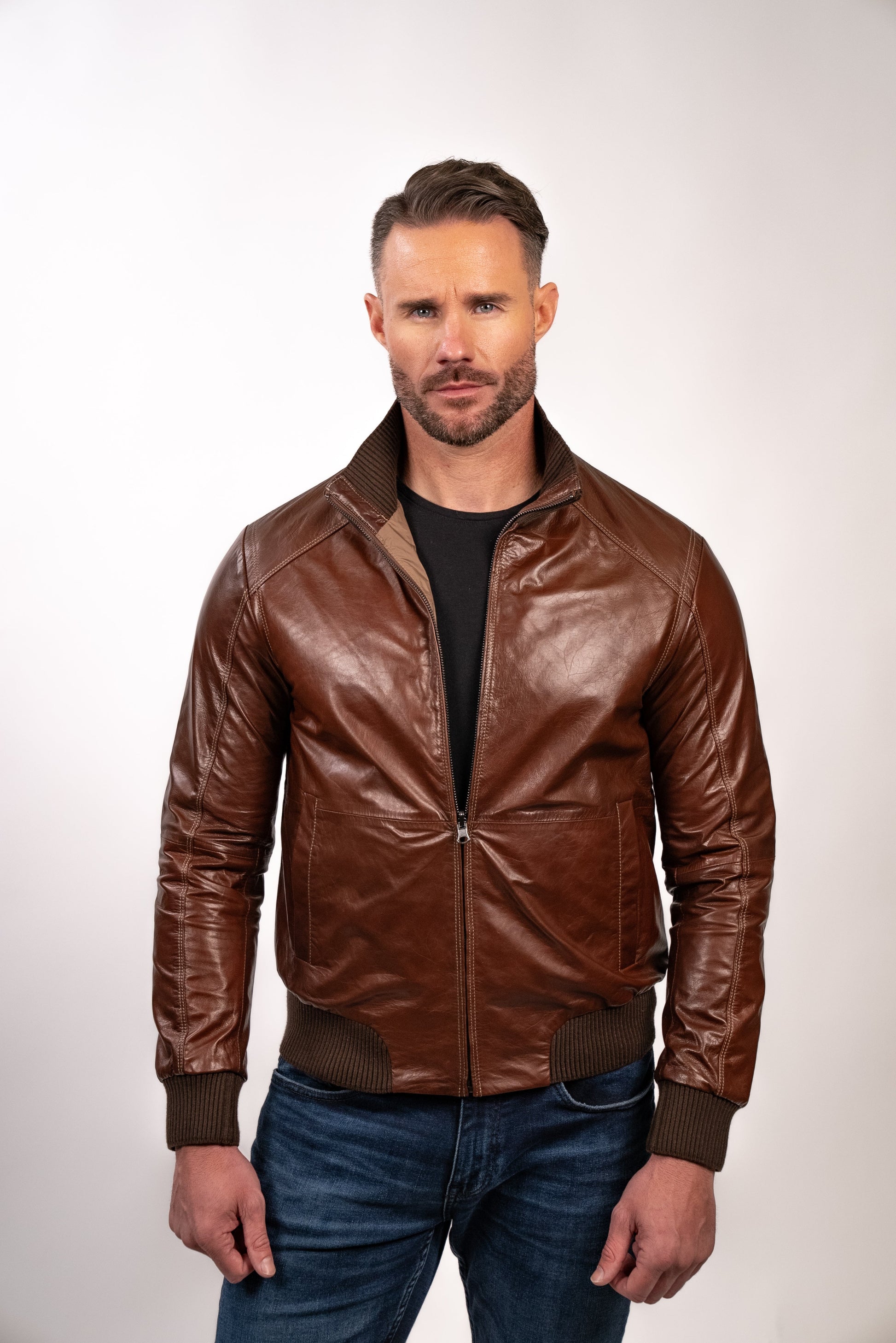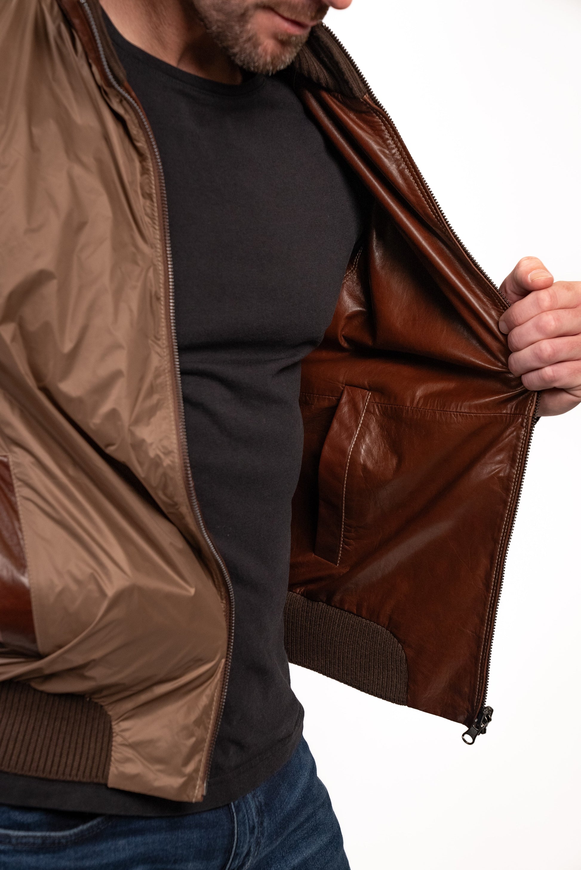 Reversed, the jacket’s elasticized ribbing, like the side-entry pocket welts, is grey, and the lamb nappa leather shell gives way to a sporty blue, down-proof nylon.